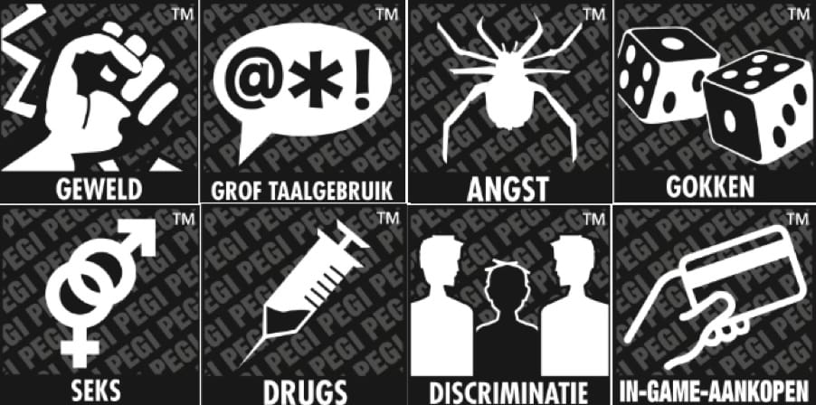PEGI geeft advies over videogames met pictogrammen (kleine plaatjes). Er zijn pictogrammen met leeftijden (zie afbeelding 1) en pictogrammen die gaan over de inhoud. Ze geven bijvoorbeeld aan of er geweld, grof taalgebruik of seks in het spel voorkomt (zie afbeelding 2). De PEGI-indeling zegt niks over hoe moeilijk het spel is.